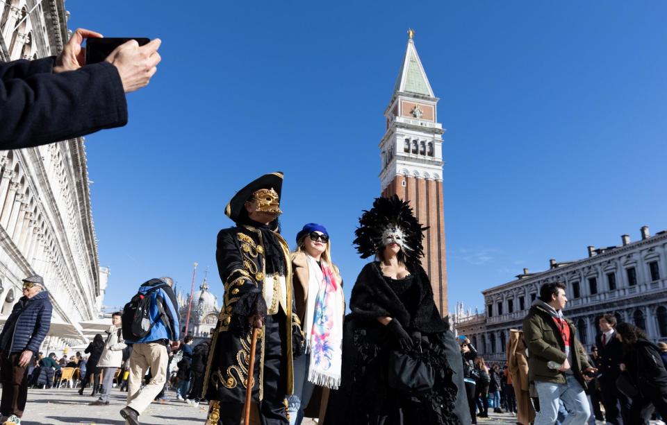 2月13日,人们戴着面具在意大利威尼斯圣马可广场留影。新华社记者李京摄
