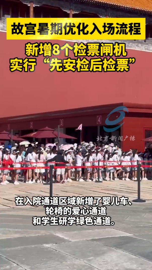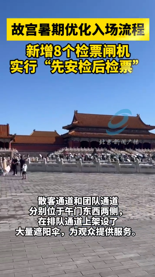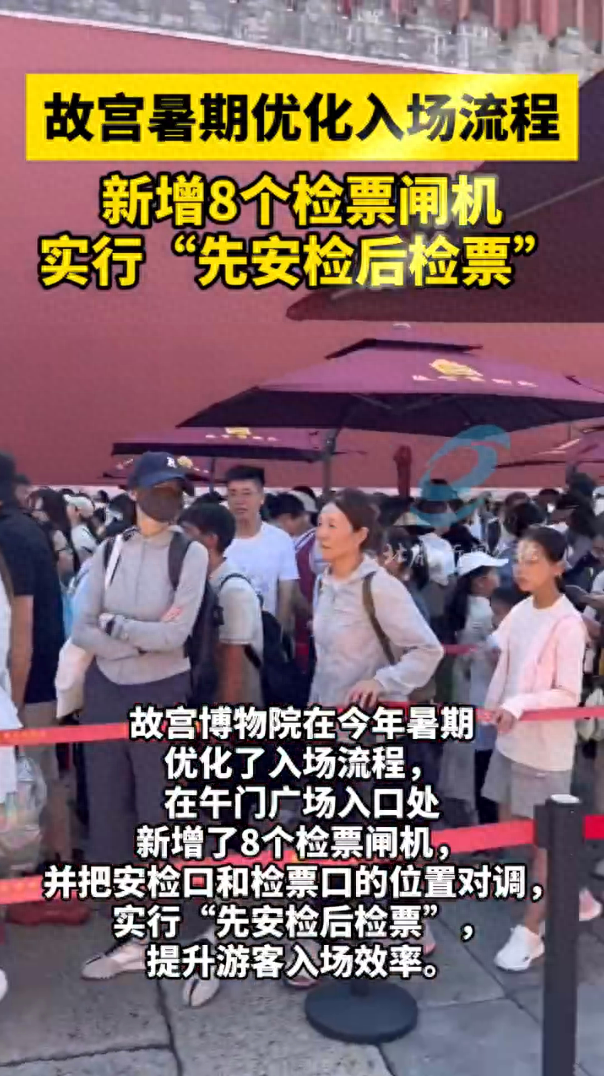 7月18日,据北京新闻广播:故宫博物院在今年暑期优化了入场流程,在午门广场入口处新增了8个检票闸机,并把安检口和检票口的位置对调,实行“先安检后检票”,提升游客入场效率。