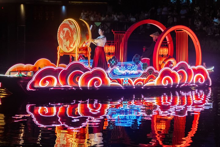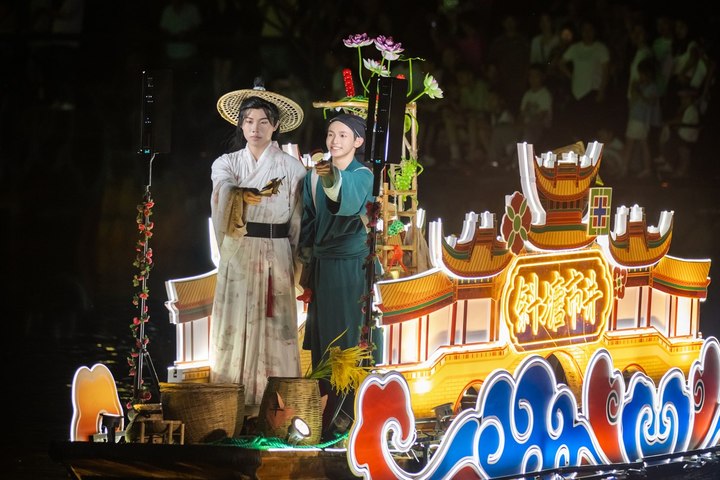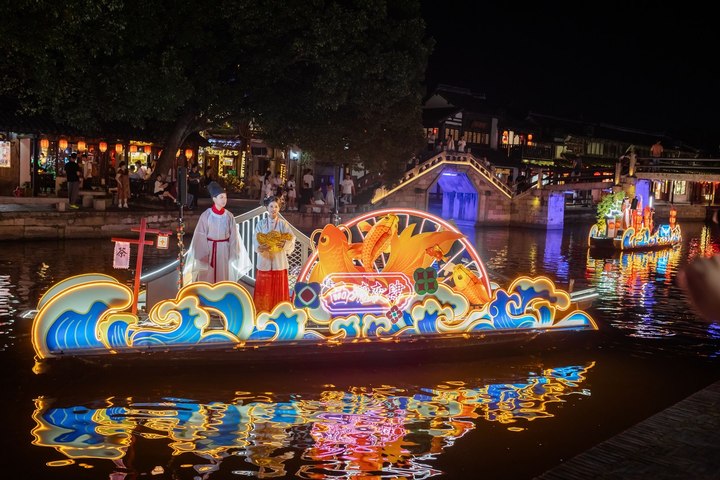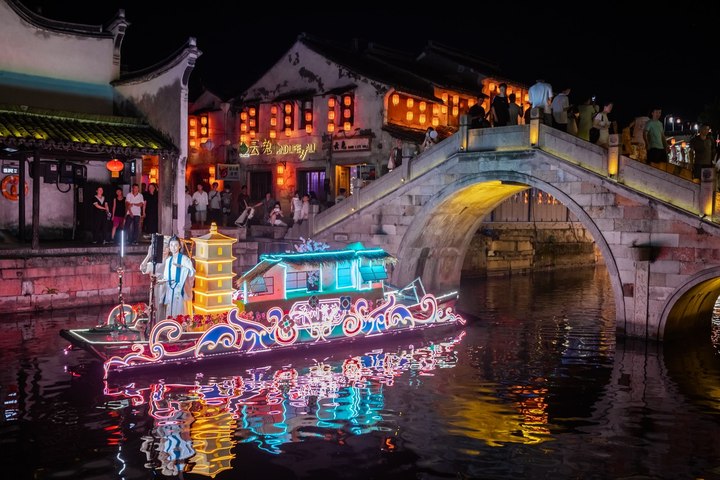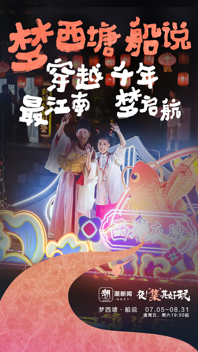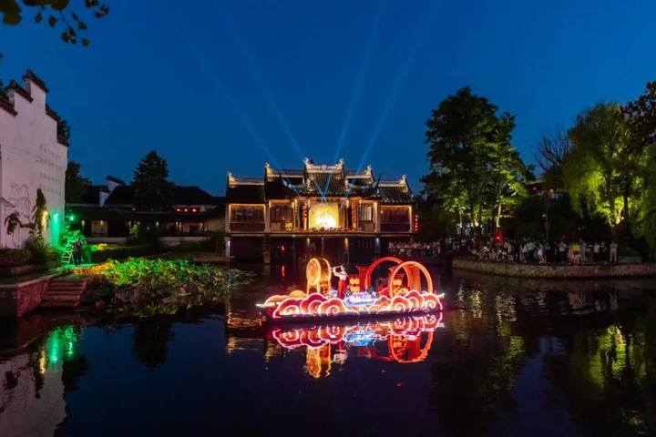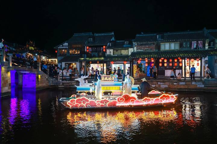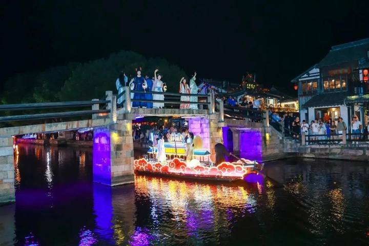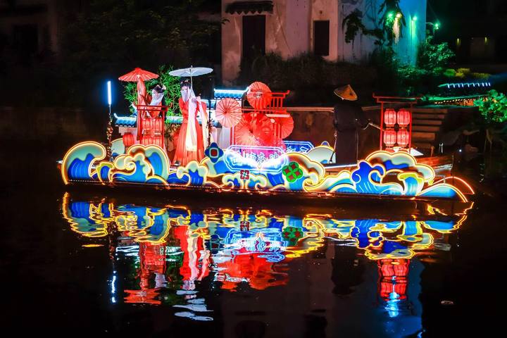 7月5日起,西塘古镇护国随粮王庙古戏台上璀璨的灯光亮起,万众瞩目的西塘古镇首个江南水乡情景式夜游活动——“《梦西塘·船说》花船巡游”鸣锣开航,八艘流光溢彩的古风花船,满载着对西塘千年历史的深刻致敬与创意诠释惊艳亮相。