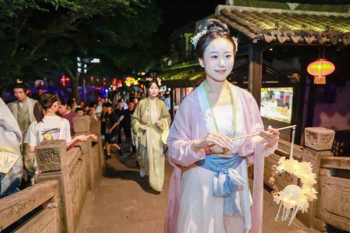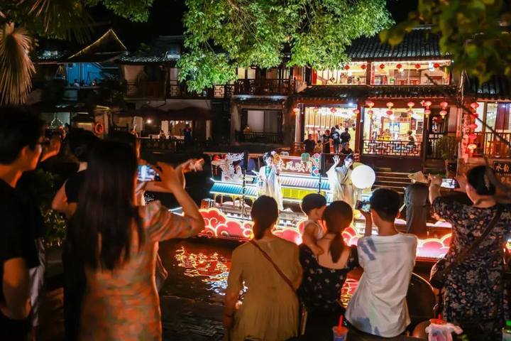 越剧雅韵,梦回西塘夜肆。吉字号花船,将越剧音乐巧妙融入西塘夜肆的繁华景致之中,再现西塘古代生活的点点滴滴,让游客在欣赏美轮美奂表演的同时,仿佛穿越回那段充满烟火气的繁华夜市,满载而归的喜悦与满足溢于言表。