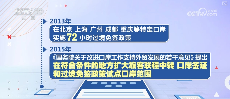 2013年,在北京、上海、广州、成都、重庆等特定口岸实施72小时过境免签政策。2015年,《国务院关于改进口岸工作支持外贸发展的若干意见》提出,“在符合条件的地方扩大旅客联程中转、口岸签证和过境免签政策试点口岸范围。”