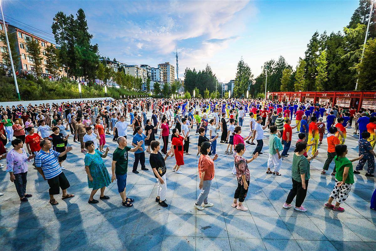在利川苏马荡新市民广场,“候鸟”们正在跳广场舞。(通讯员 郭贤乐摄)