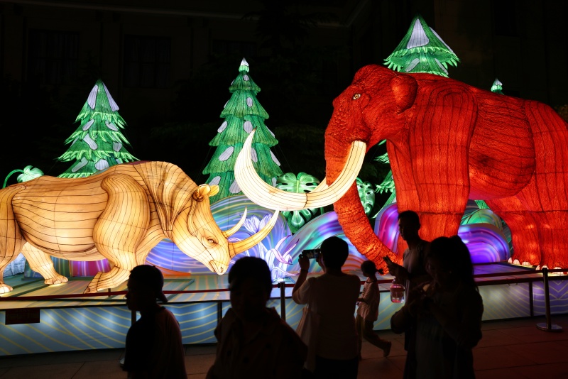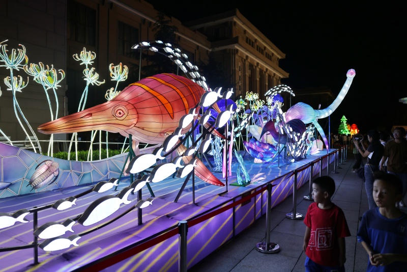 今年的“博物馆之夜”一大亮点莫过于四川自贡的“非遗彩灯”,它们在国家自然博物馆的广场上绚丽绽放,为“博物馆之夜”增添了一抹亮丽的风景线。这些“非遗彩灯”通过中华传统制作技艺与自然科学的巧妙融合,展现了远古陆地与远古海洋的生物,观众仿佛穿越时空,亲历亿万年前的生态奇观。