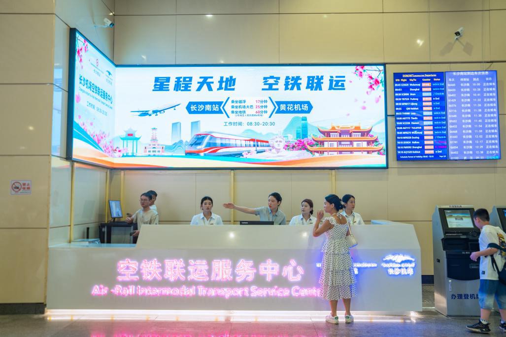 空铁联运服务升级。近期,长沙机场联合长沙高铁南站、磁浮公司及各航司、OTA平台等各方,进一步升级长沙空铁联运合作。长沙机场与长沙高铁南站互设空铁联运转乘服务点,并正式启用“空铁联运服务中心”。长沙高铁南站的服务中心位于负一楼南2出站口外侧往东广场方向80m,该处柜台可为空铁联运旅客提供机场信息咨询、登机牌办理、行李托运指引、首乘旅客指引、特殊旅客指引、行李寄送指引、优享服务预约、磁浮购票、高铁票自助改签退票等相关服务。长沙机场T2航站楼的服务中心位于到达厅出口处设置空转铁转乘服务点,可为旅客提供高铁车次正晚点查询、自助领取高铁报销凭证以及高铁旅客问询答疑等服务。