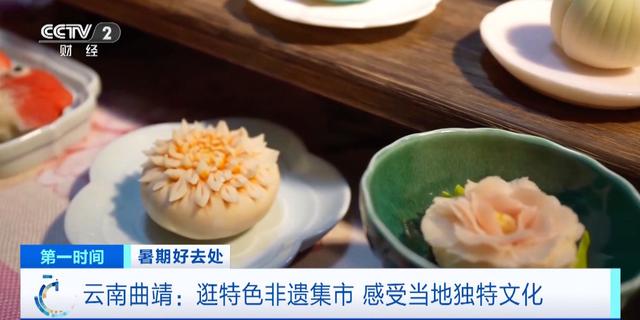 逛累了还能来到美食摊位品尝特色美食,如云南省级非物质文化遗产“蒸饵丝”。此外,还有曲靖小粑粑、糖画、糖人、黄豆腐等美食。