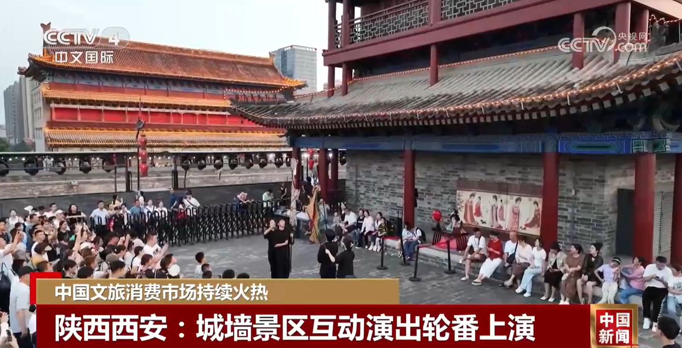 作为中国现存规模最大、保存最完整的古代城垣,西安城墙成为游客们“CityWalk”的第一站。城墙景区每周共有88场互动演出在永宁门轮番上演,游客边逛景区边欣赏秦腔演出、琵琶演奏、互动皮影。而随着入境游热度不断升温,外国游客也出现在西安大街小巷。
