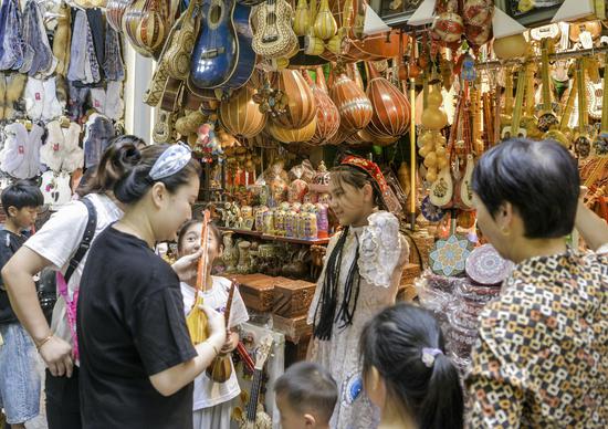 8月7日,位于乌鲁木齐市的新疆国际大巴扎景区,游客选购民族乐器。 中新社记者刘新摄