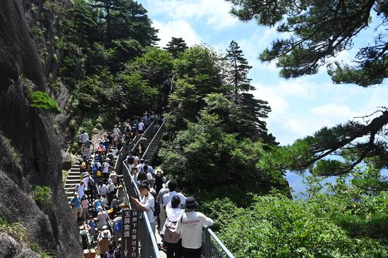 7月31日,在安徽省黄山风景区,游客们登山游览,感受夏日黄山魅力。 中新社记者韩苏原摄