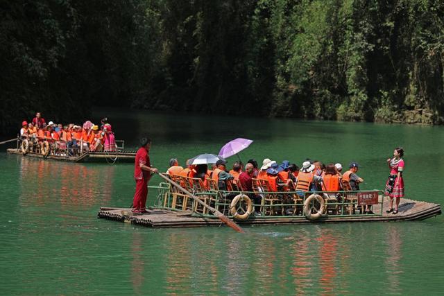 游客在阿依河景区体验竹筏放歌旅游项目。(赵勇 摄)