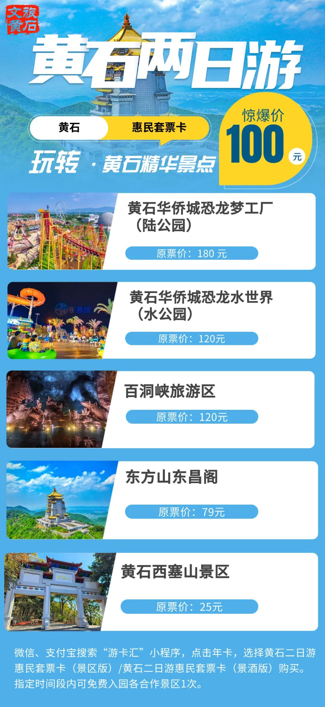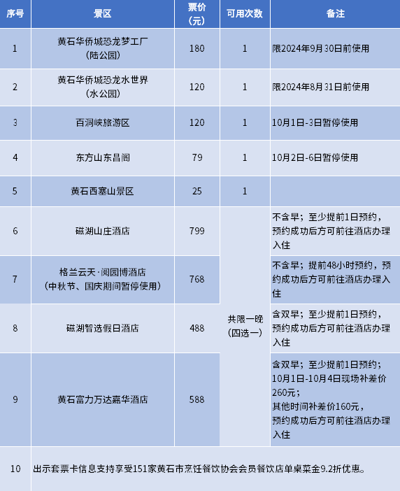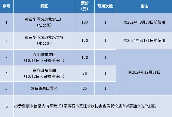 2、黄石华侨城恐龙水世界(水公园)限2024年8月31日前使用;黄石华侨城恐龙梦工厂(陆公园)限2024年9月30日前使用。百洞峡旅游区10月1日-3日暂停使用。东方山东昌阁10月2日-6日暂停使用。