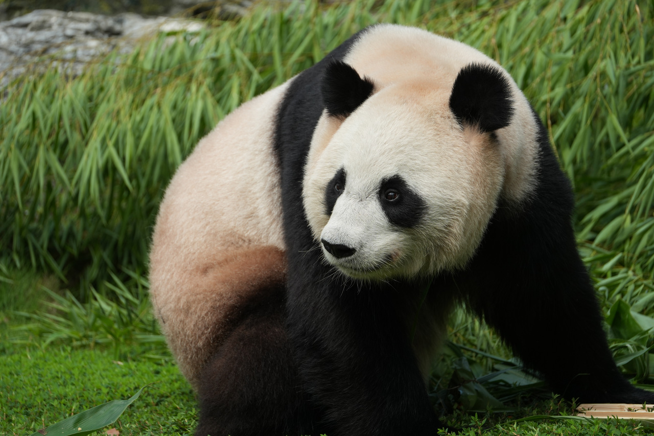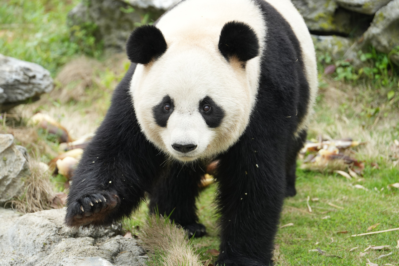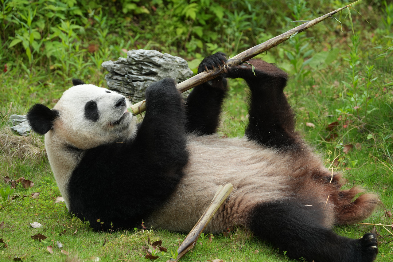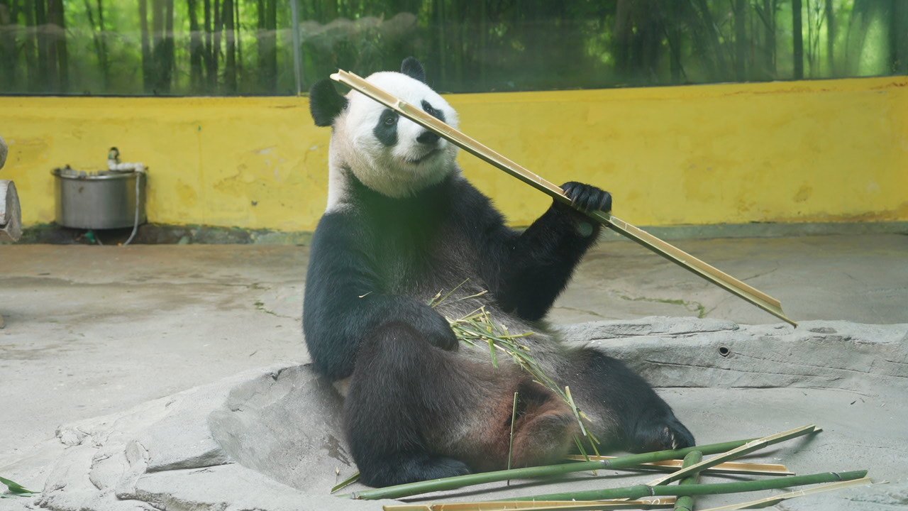 “半半性格聪慧活泼,个性谨慎但好奇心强,经常做出出人意料的举止,比较‘叛逆’吧。”半半的奶爸对半半的喜好了如指掌,他说,半半喜欢游泳、爬树、拆家、吃笋笋,半半吃饭的时候喜欢靠坐,专心致志干饭,吃得很细致。在现场,大家实地见证了“干饭熊”的吃播时刻,只见它懒懒地斜躺在一个小坑里(猫粉们称这是半半的“贵妃坐”),它一根接着一根地拿起竹子、用嘴剥皮后咔咔咔的咬着,一气呵成,一眨眼一根竹子下肚,不一会儿胖鼓鼓的肚子上就堆了一肚皮的竹子皮……当然它也会自己清理“小桌板”肚皮。