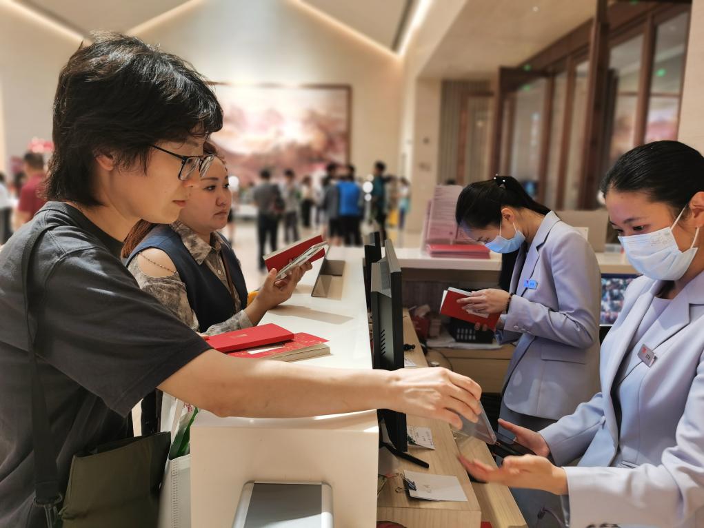 6月7日,观众在中共一大纪念馆领取免费的《光荣之城 红色“沪”照》寻访手册,可根据手册指引参与“红色印记”上海城市红色寻访活动。新华社记者 陈爱平 摄