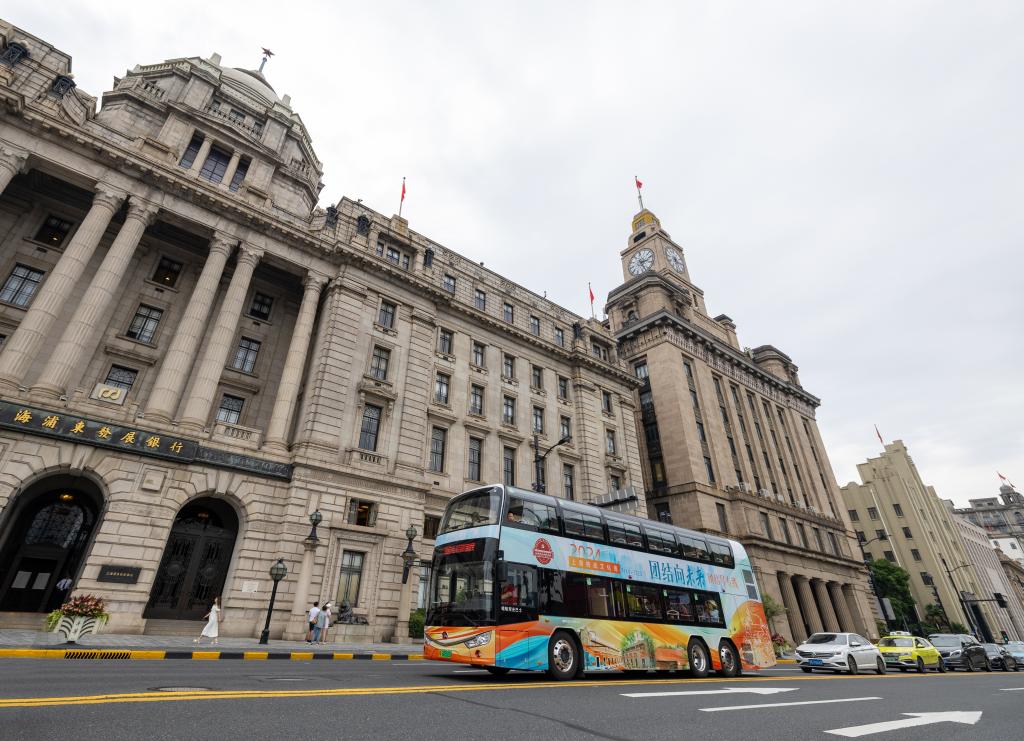 7月中旬,上海统战文化主题观光巴士“团结号”驶过上海外滩区域。新华社记者 陈爱平 摄