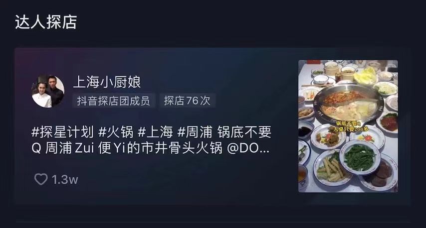 这则风格平实又松弛的探店视频很贴合小店的气质。老板是建筑业出身,有了闲钱,和一班朋友们投资开了这家店。没有太多经营压力,店内的用餐气氛放松又火热,颇有山城火锅的感觉。庄丽君的镜头随意一拍,这家别具风味的小镇火锅店就走红了,抖音团购销量上升到上海第一,超过了市区内的知名连锁火锅店。很多网友驱车二三十公里,从市区赶来打卡。