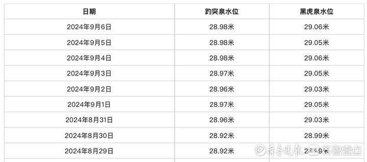 根据济南市城乡水务局官网发布的水位数据,9月6日7时,趵突泉地下水位为28.98米,黑虎泉地下水位为29.06米,均为今年以来最高值。