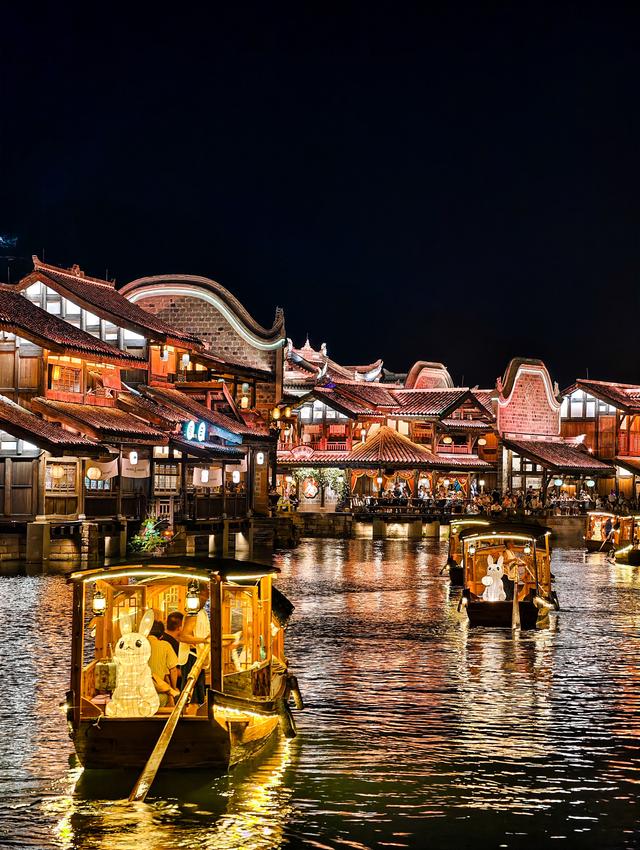 9月16日晚,在四川省宜宾市翠屏区李庄古镇,游客乘“玉兔船”泛舟慢游。新华社发(叶昌荣摄)