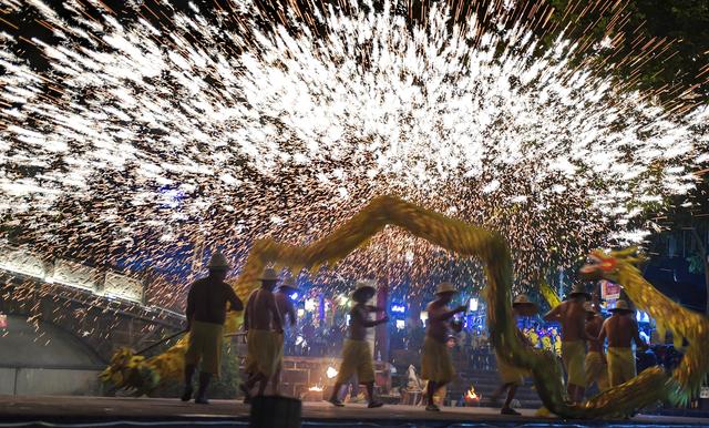 9月16日,四川省成都市双流区黄龙溪古镇,当地艺人为游客表演国家级非遗“火龙灯舞”。新华社发(李向雨摄)