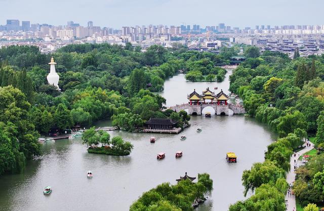 9月17日,游客在江苏扬州瘦西湖风景区游玩(无人机照片)。新华社发(孟德龙摄)