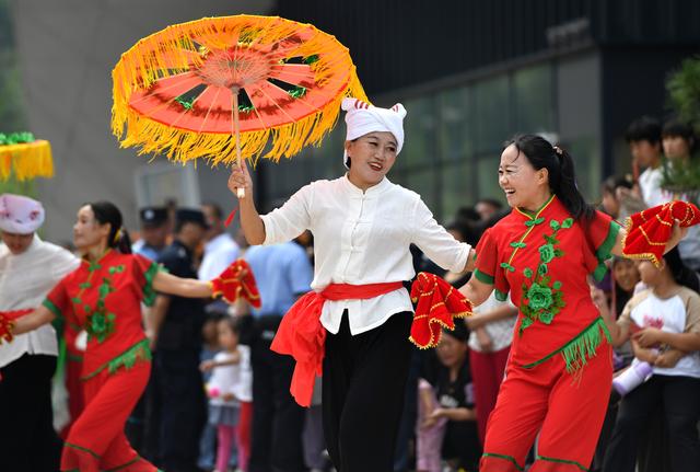 9月17日,在河北省石家庄市平山县光禄山风景区,当地群众为游客表演秧歌。新华社发(张晓峰摄)