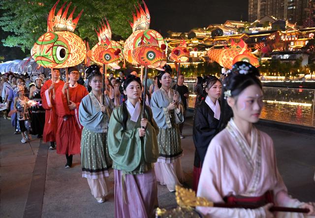 9月16日晚,在湖北省宣恩县城贡水河畔,人们身着传统服饰参加巡游活动。新华社发(宋文摄)