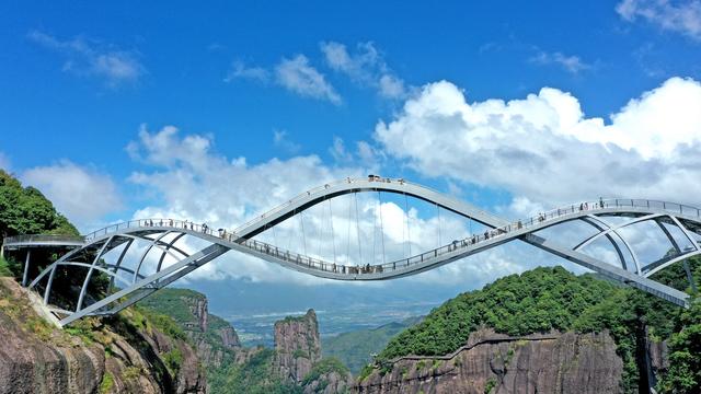 9月17日,游客在浙江省台州市仙居县神仙居景区如意桥上游玩(无人机照片)。新华社发(王华斌摄)