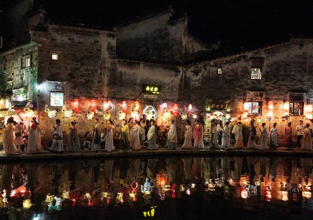 9月15日,花灯表演队伍在安徽省黄山市黟县宏村巡游(无人机照片)。新华社发(施亚磊摄)