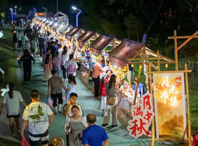 9月15日,游客在江苏省泰兴市龙河湾公园逛“月光市集”(无人机照片)。新华社发(顾继红摄)