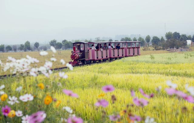 9月15日,在河南省洛阳市汝阳县三屯镇东保村“稻田小镇”,游客乘坐小火车在稻田旅游观光。 新华社发(康红军摄)