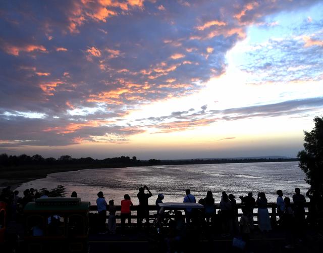 9月17日,郑州黄河南裹头广场,游客观赏晚霞。新华社发(周勇摄)
