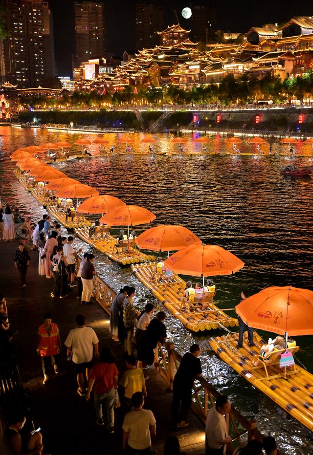 9月17日晚,游客在湖北省宣恩县城贡水河中乘坐竹筏赏夜景。新华社发(宋文摄)