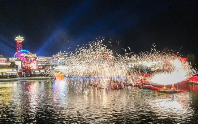 9月16日晚,民间艺人在河北省唐山市丰南区河头老街景区为游客表演打铁花(无人机照片)。新华社发(刘满仓摄)