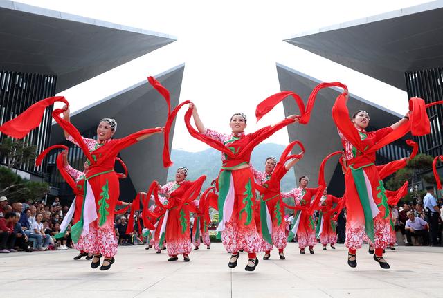 9月17日,在河北省石家庄市平山县光禄山风景区,当地群众为游客表演秧歌。新华社发(梁子栋摄)