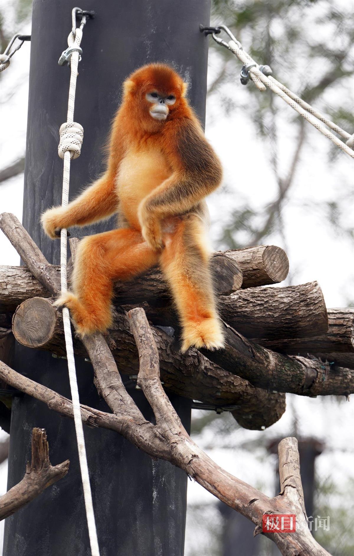 川金丝猴外场馆,川金丝猴小宝一身金色毛发,特别漂亮,引发围观。“川金丝猴刚出生时毛发是灰黑色的,慢慢变成金色。”科普讲解员现场给游客们讲解它的变化。