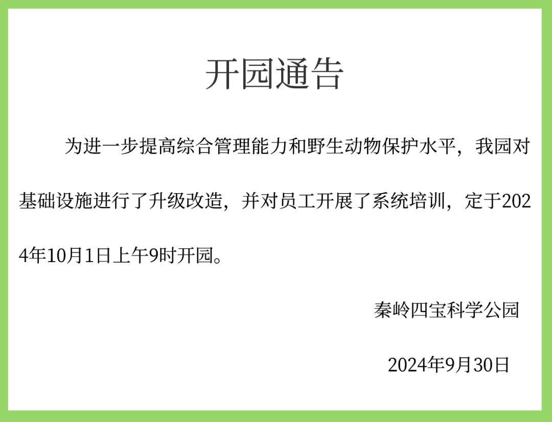 2024年9月30日,秦岭四宝科学公园发布《开园通告》,内容如下: