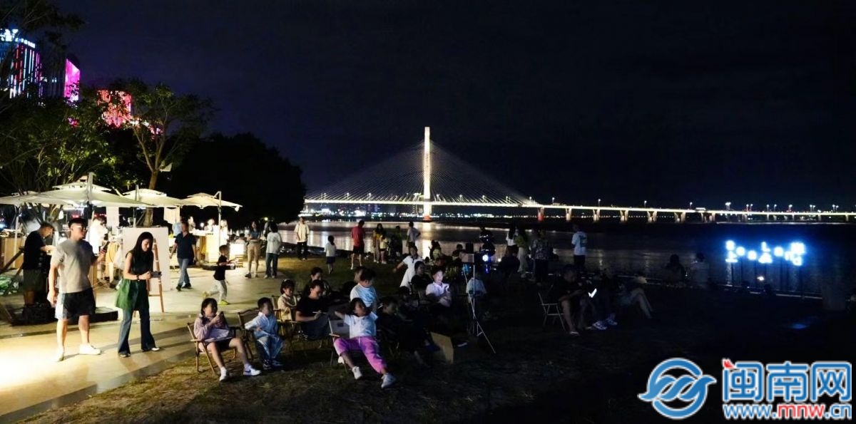 6日晚上,记者走进这里,映入眼帘的上岸Sealand、海上红日艺术灯光装置以及波光下的倒影,妆点了浪漫的夜晚。迎面望去,夜幕下的江海成为幕布,吸引了众多市民游客拍照打卡。四周整齐地摆放着露营装备,让人们与大自然在此开启一场亲密对话;海边电影投屏荧幕则为人们带来了一场视觉盛宴,让市民游客在假期中感受着别样浪漫与惬意。