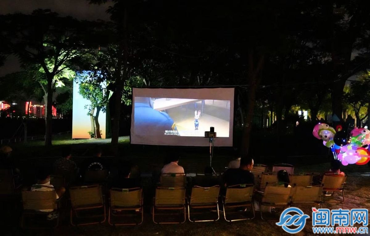 市民游客正在观看露天电影
