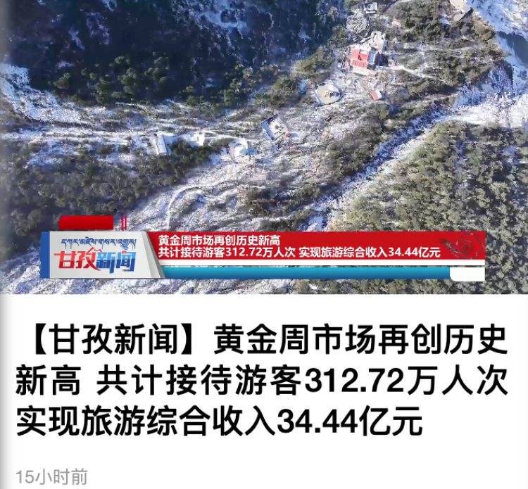 四川省甘孜州的自然风光一直以来广受好评,雪山、湖泊、草原等独特的自然景观成为游客打卡川西的主要目的地之一。10月8日,四川省甘孜州在国庆黄金周期间取得了亮眼的旅游成绩。根据当地官方媒体“圣洁甘孜”昨日报道,“从10月1日至10月7日,甘孜州共计接待国内外游客312.72万人次,同比增长13.85%;实现旅游综合收入34.44亿元,同比增长14%。两项数据均创该州国庆黄金周旅游接待历史新高。”如此亮眼的成绩引发了网友们的广泛关注和讨论,尤其是人均消费问题成为了热点话题。上游新闻(报料邮箱:baoliaosy@163.com)记者算了一笔账,7天旅游收入34.44亿元,按照接待游客312.72万人次计算,7天每人次旅游消费约1101.3元。