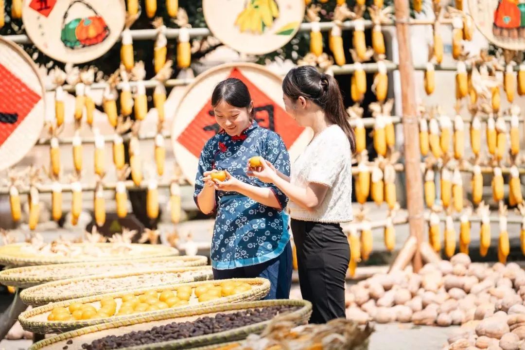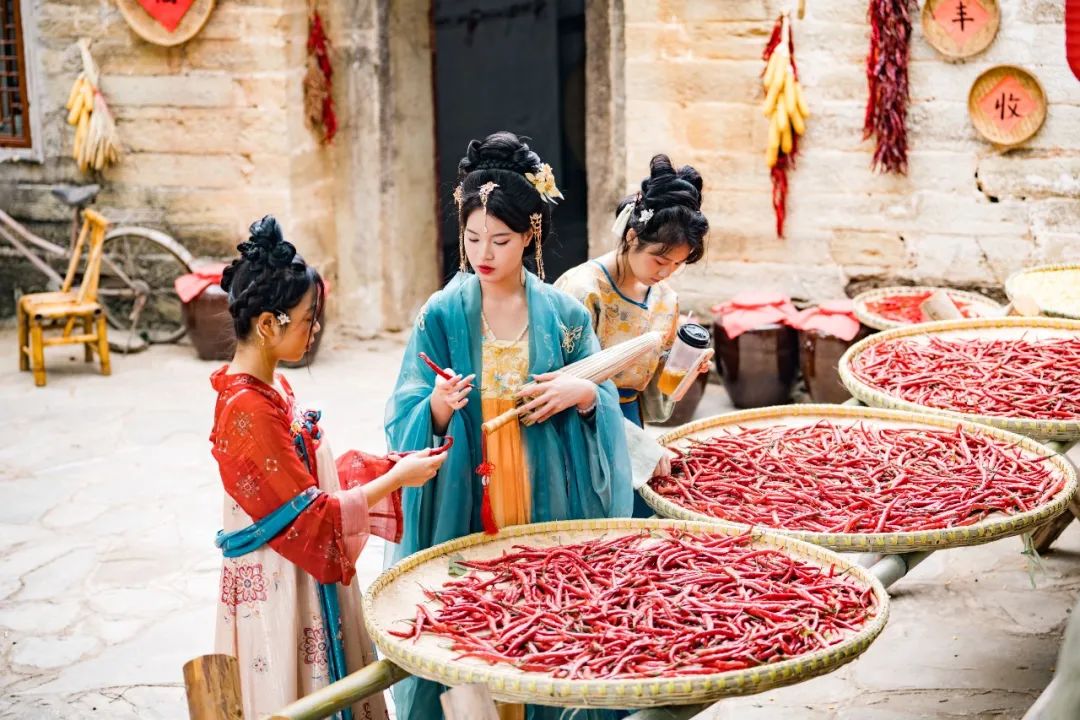 游客们在欣赏晒秋美景的同时,也能感受到古老农耕文化的独特魅力。大余湾晒秋,以其独特的魅力吸引着人们,成为了这个秋天里不可错过的一道风景。你还可以穿上精致的明清汉服,漫步于白墙黛瓦、小桥流水之间,仿佛穿越时空,回到了那个烟雨朦胧的江南水乡。