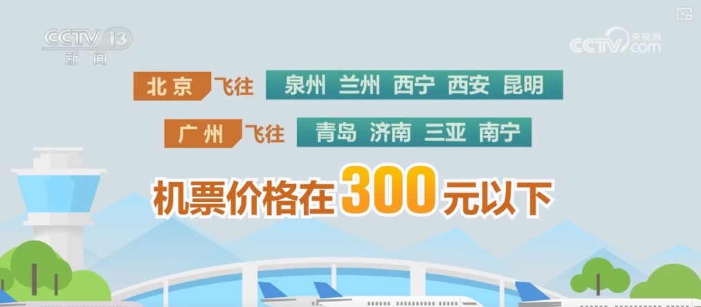 北京飞往泉州、兰州、西宁、西安、昆明,广州飞往青岛、济南、三亚、南宁,机票价格在300元以下。上海飞往揭阳、郑州、长沙、哈尔滨、重庆,机票价格在200元以下。