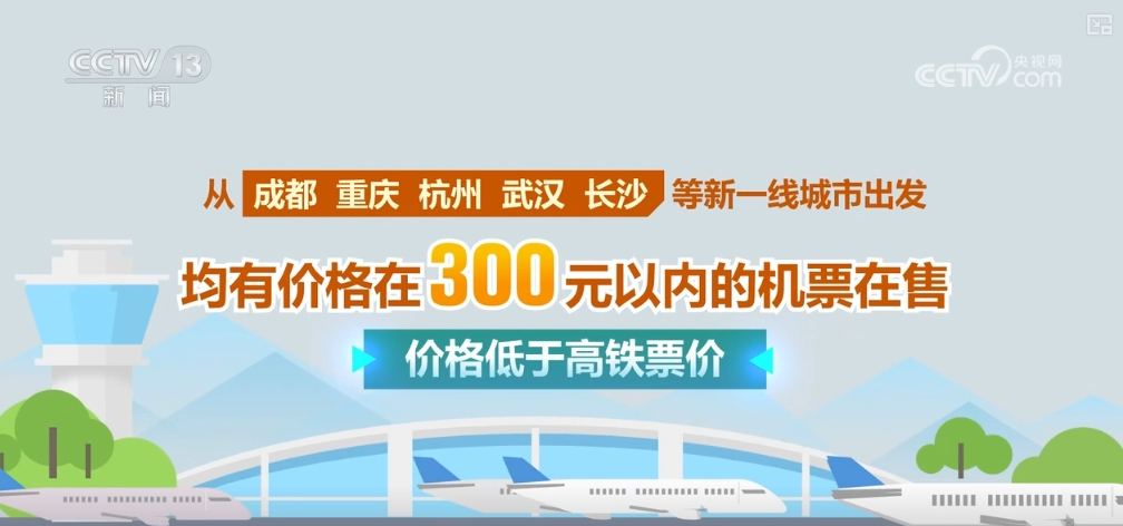 从成都、重庆、杭州、武汉、长沙等新一线城市出发,均有价格在300元以内的机票在售,价格低于高铁票价。