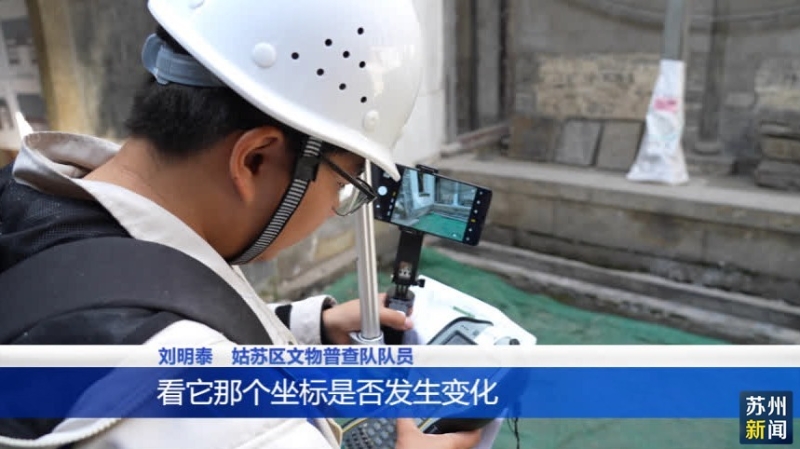 姑苏区文物普查队队员刘明泰介绍,RTK一般用来测量古建筑的平面坐标还有它的高程,一般像这种房子的话,去测一下它的拐角点,和现有的资料地形图上来复核,看它的坐标是否发生变化。