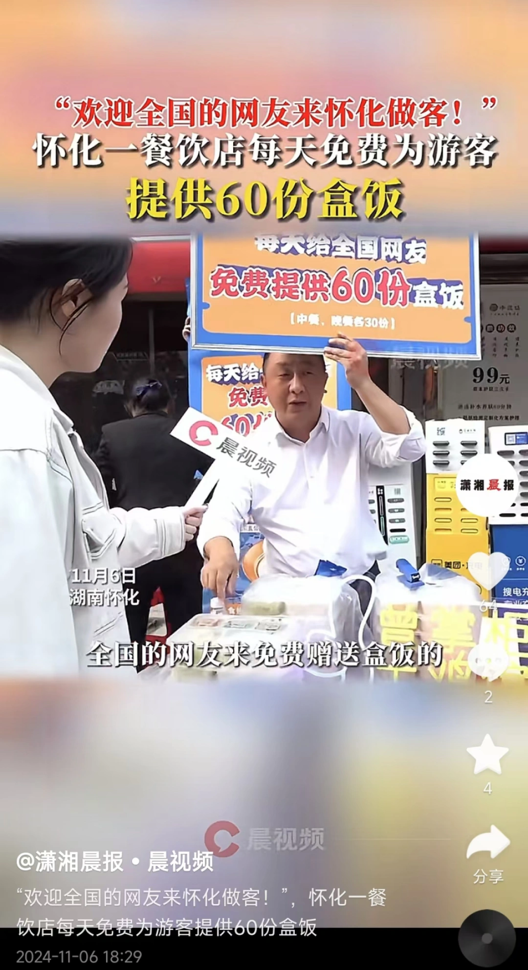 怀化的一家餐饮店也出来接流量了,宣布每天免费为游客提供60份盒饭,中午和晚上都有。老板介绍:“今天的盒饭里有辣椒炒肉、青豆肉沫还有杏鲍菇。”还表示:“欢迎全国的网友来怀化做客!”
