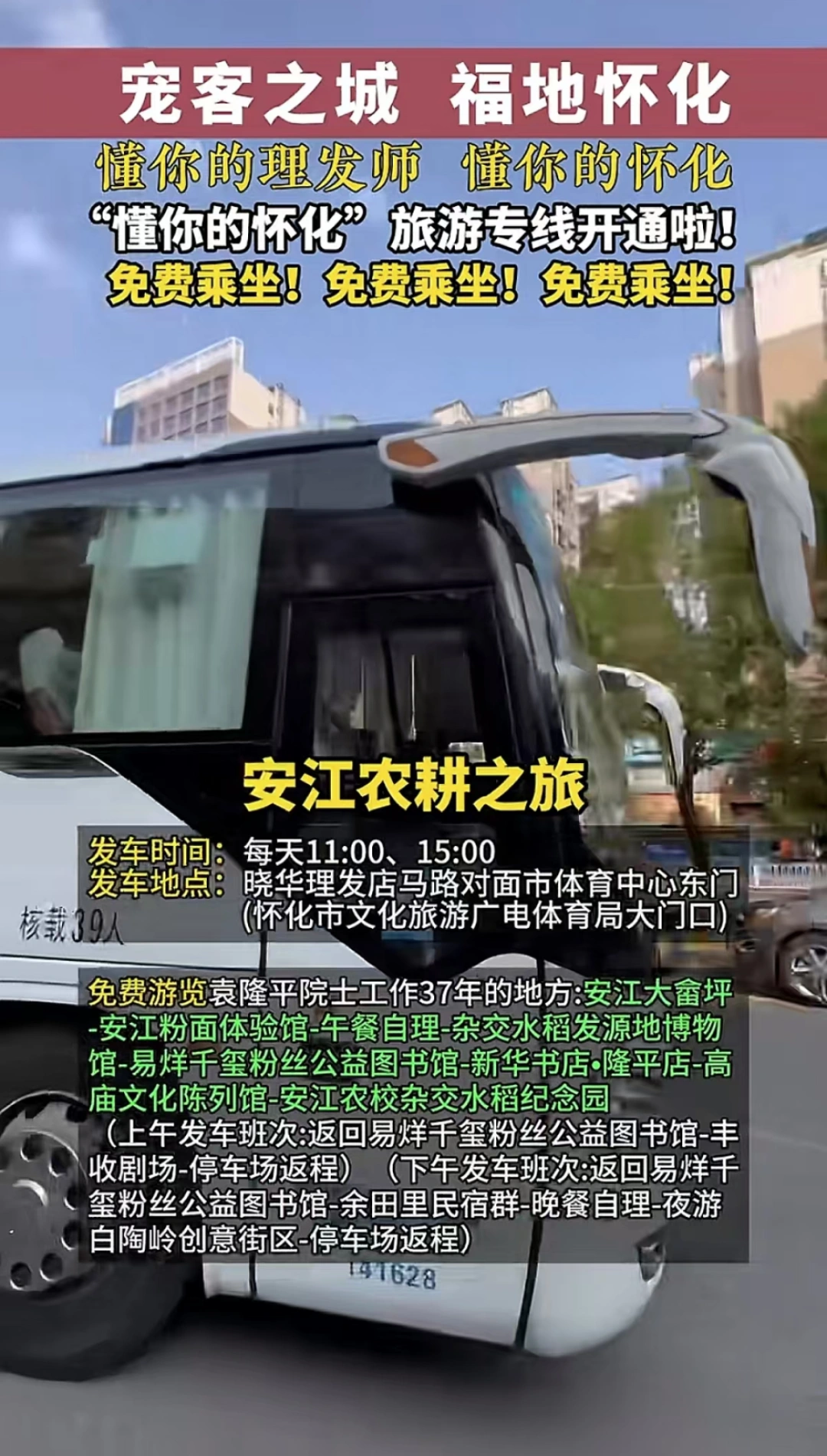 怀化文旅推出了安江农耕之旅和芷江和平之旅两条旅游专线,免费乘坐,发车地点醒目标注: