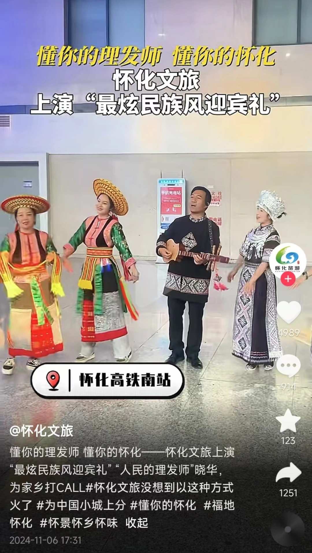 11月6号一天内,怀化文旅官方抖音号就一口气发布了11条和理发师晓华相关的视频,还邀请了晓华拍了两条短视频为怀化代言。镜头中,晓华说:“剪美美的头发,游美美的怀化!欢迎大家来福地怀化旅游,顺便找我剪头发。”