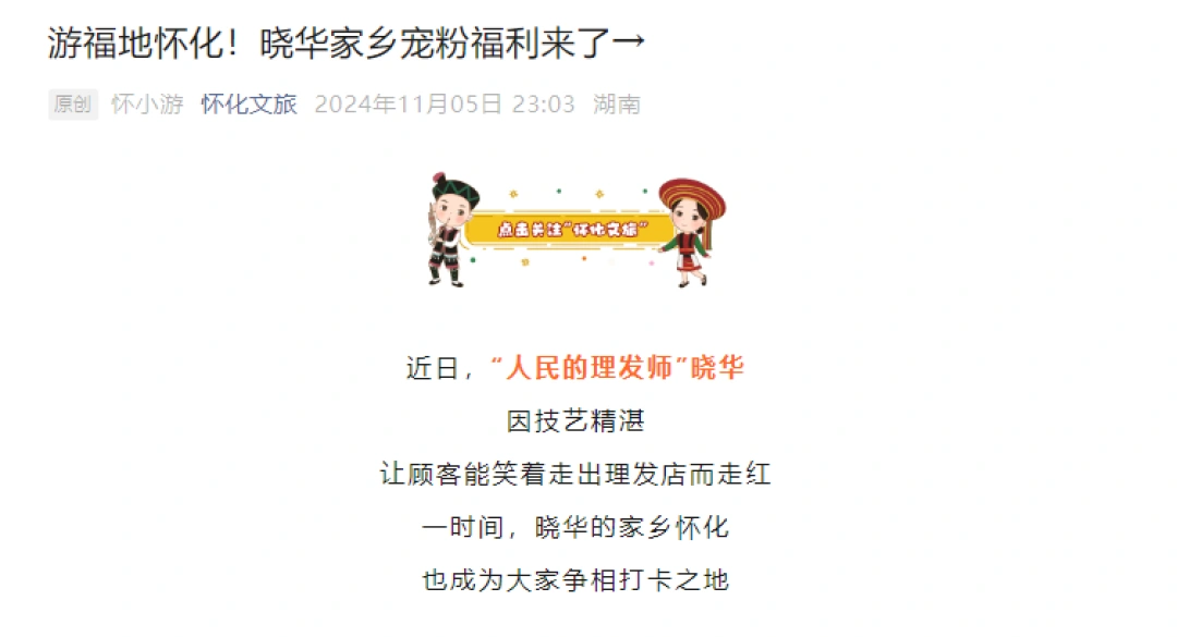 怀化文旅还搬出了两位怀化籍的明星——易烊千玺和成毅,与晓华隔空互动,并特别备注:易烊千玺的家乡洪江市距离晓华门店60km,成毅的家乡辰溪距晓华门店77km。网友们也纷纷到两位明星的社交账号下留言:“怀化在召唤,回家剪头发啦!”