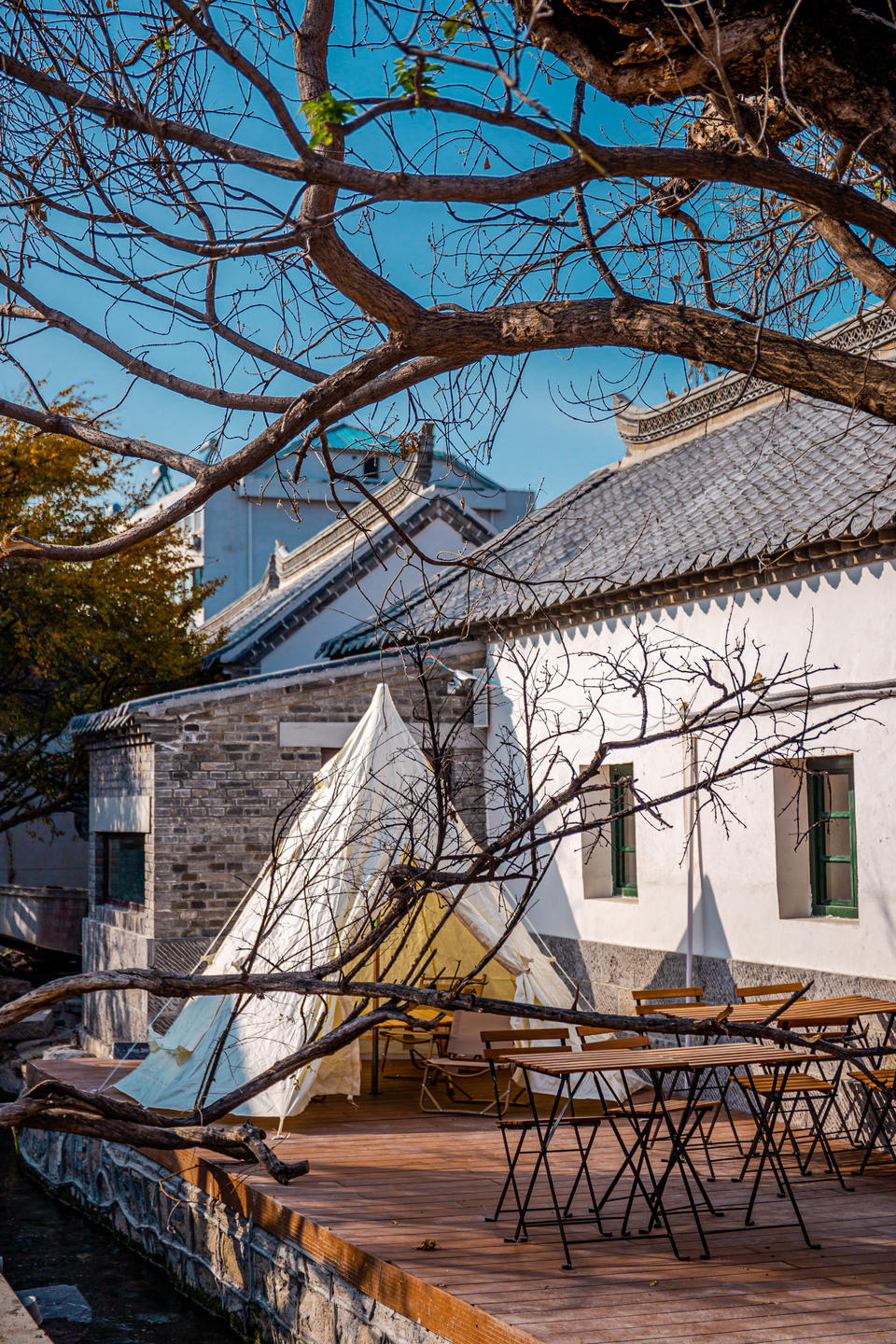一尺花园(大明湖店)的选址别具匠心,位于济南古城区的西更道街2号和东花墙子14号,这里曾是《老残游记》中主角老残居住的高升店所在地。这个充满历史底蕴的院落,东西两门,东门在西更道北首路西,西门外便是府学文庙正门。院内王府池子流经南北院落,一棵无名古树与涓涓流水既见证了岁月的流转,也如同时空的桥梁,连接着古今。