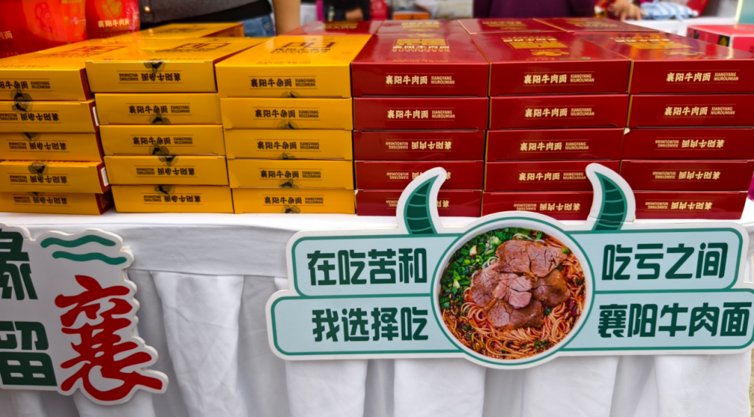 现场准备的40多箱襄阳牛肉面不到半天销售一空,两天连续补货四次全部销售完毕。