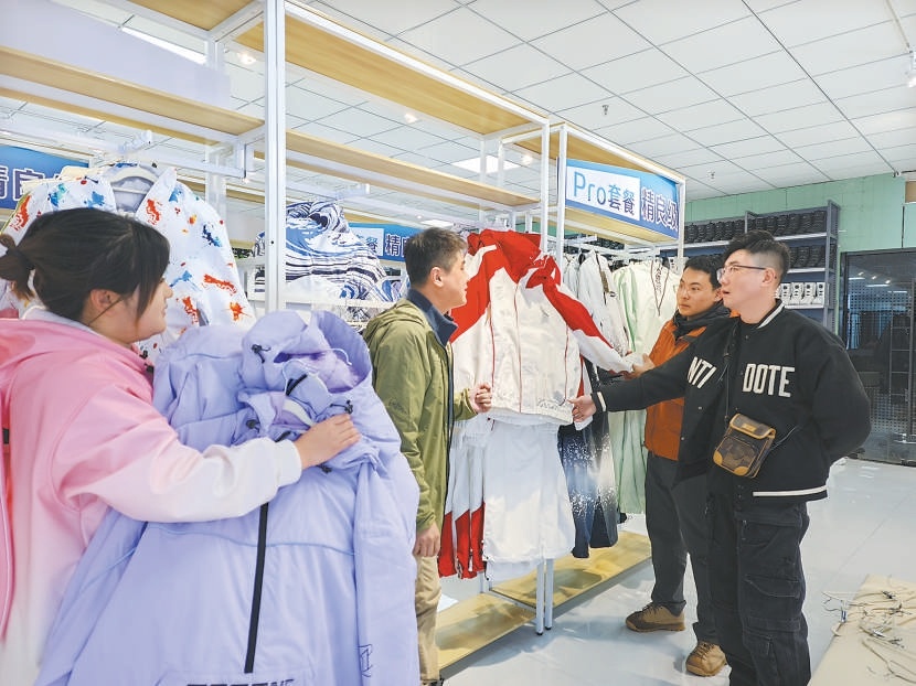 在位于太子城高铁站外的雪具店,几位顾客正在选购滑雪服。(李如意摄)