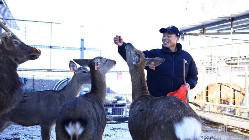 村民何斌正在和梅花鹿互动(央广网发任东升摄)