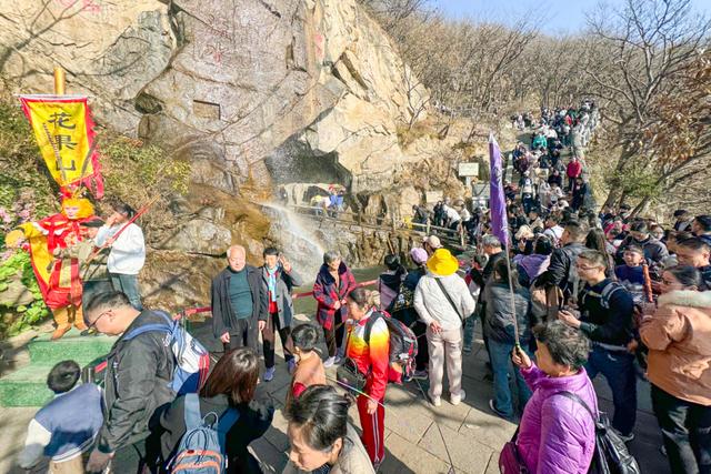 “早就听说花果山入秋后,漫山遍野都是层林尽染,于是趁着入冬前后,也就是现在的免票阶段,带着家人来这里踏秋,也想与‘深秋祈福金身大圣’来次合影!”近日,在花果山景区九龙桥附近,从徐州来连旅游的王先生一家开心地说。